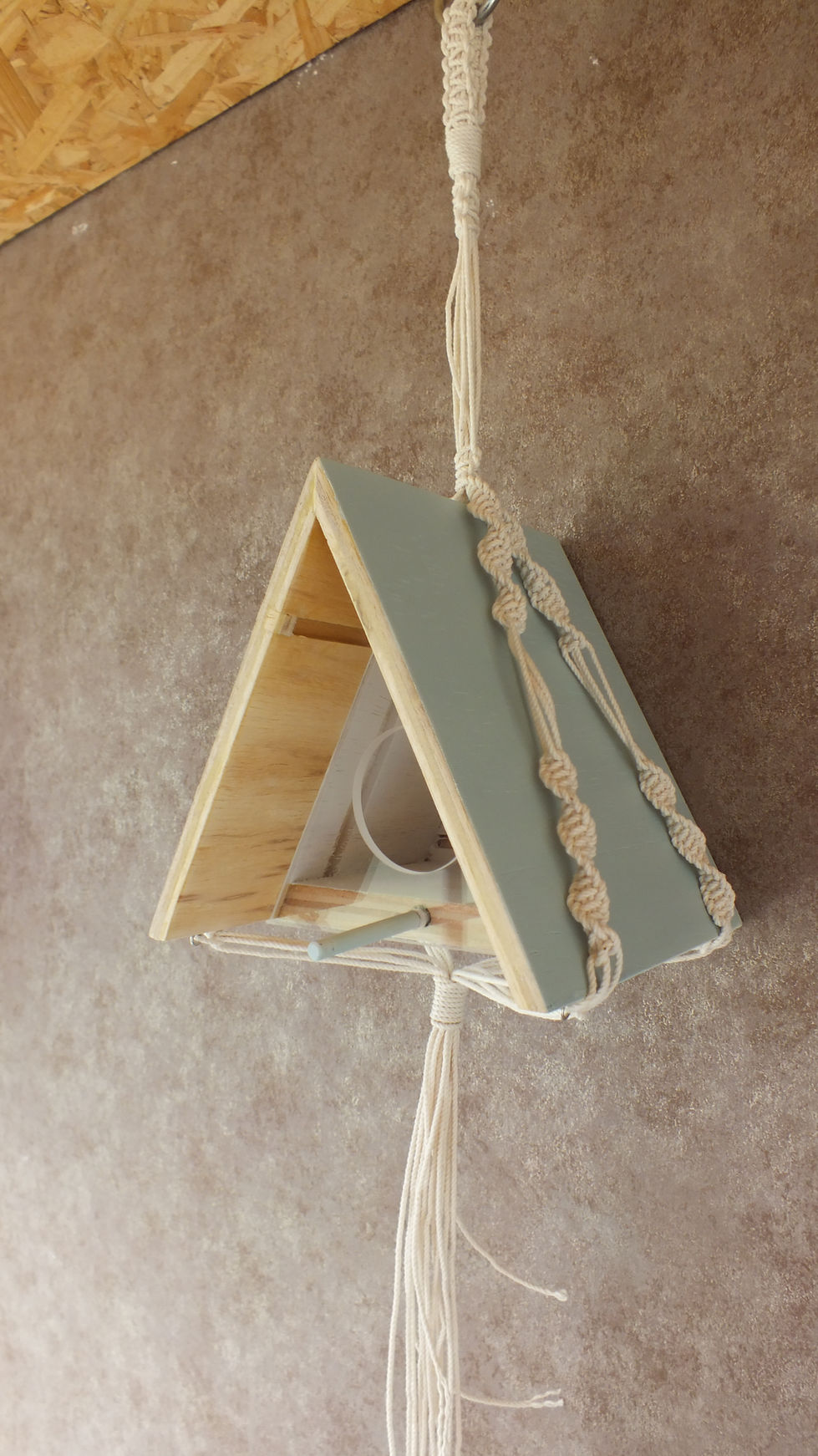 Una Casa de pájaro creada con madera plywood y colgante en macramé