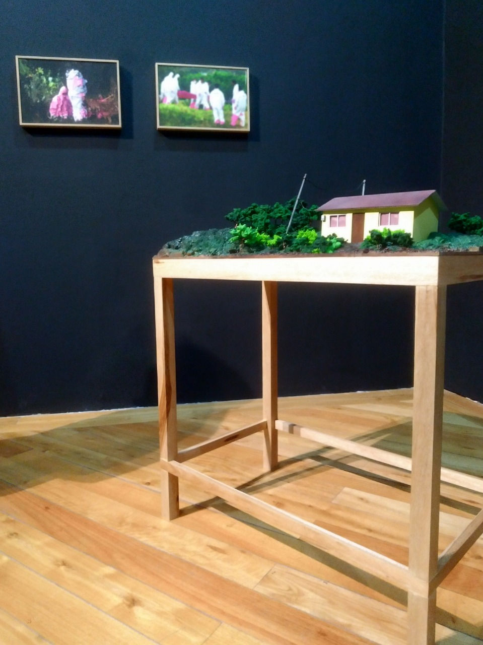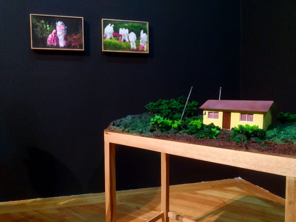 Pazmiño, P. (2019). Paisaje [Instalación: maqueta, pintura en acrílico e impresión fotográfica digital]. Quito, Centro de Arte Contemporáneo.